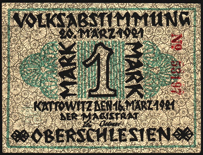Na awersie w górnej części napis nawiązujący do Plebiscytu z 1921 roku: Volksabstimmung Oberschlesien 20 märz 1921, w centralnej części napis Mark 1 Mark, poniżej napis: Kattowitz den 16 märz 1921 der Magistrat Oberschlesien, z prawej strony numer seryjny. Na rewersie rycina przedstawiająca zarys budynków kopalnianych, poniżej w środku herb Katowic oraz data 1865, poniżej napis mówiący o dacie ważności: Gűltig bis 15 mai 1921. W dolnych rogach symbole nominałów 1.