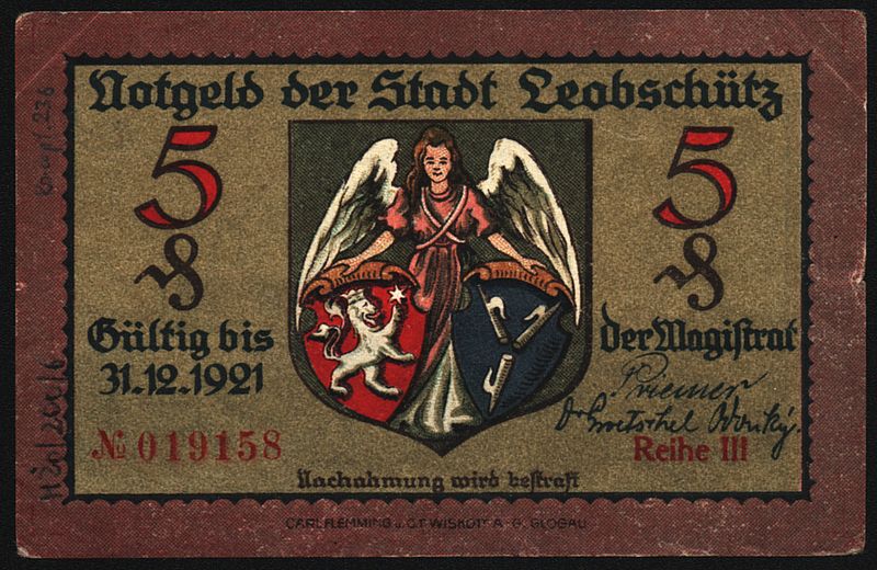 Na awersie w środkowej części herb miasta, z boków symbole nominału 5, powyżej napis: Notgeld der Stadt Leobschűtz. Poniżej informacja o dacie ważności: Gűltig bis 31.12.1921 i numer seryjny 019158. Na rewersie rycina przedstawiająca widok na miasto (zabudowania, zieleń), w prawym górnym rogu symbol nominału 5.