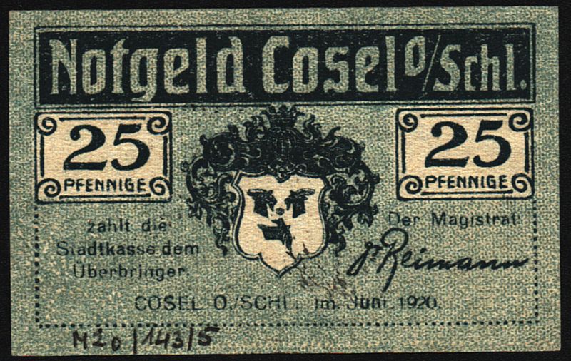 Na awersie w górnej części napis informujący, że jest to pieniądz zastępczy (pieniądz na czas potrzeby): Notgeld Cosel O/Schl. W centralnej części herb Koźla z lewego boków napis: 25 pfennige, zahit die Stadtkasse dem Űberbringer, po prawej stronie napis 25 pfennige, Der Magistrat oraz nieczytelny podpis. Poniżej napis: Cosel O./Schl. im juni 1920. W centralne części rewersu znajduje się herb Koźla i pieczęć, oraz napis informujący o terminie ważności: Dieser Gutschein, na dole: verliert teine Gűltigkeit 3 Monate nach Veröffentlichung des Einlöfungstermins.