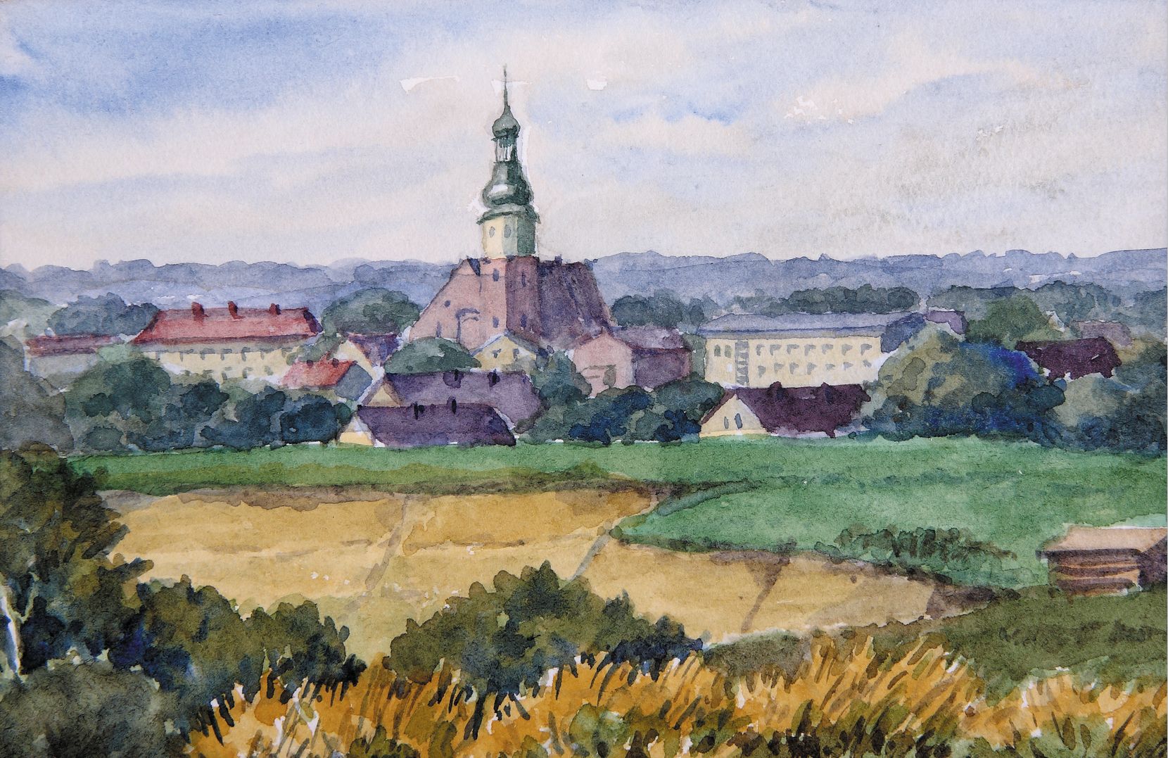 Temat/tytuł: Panorama Żor w kościołem parafialnym na pierwszym planie.