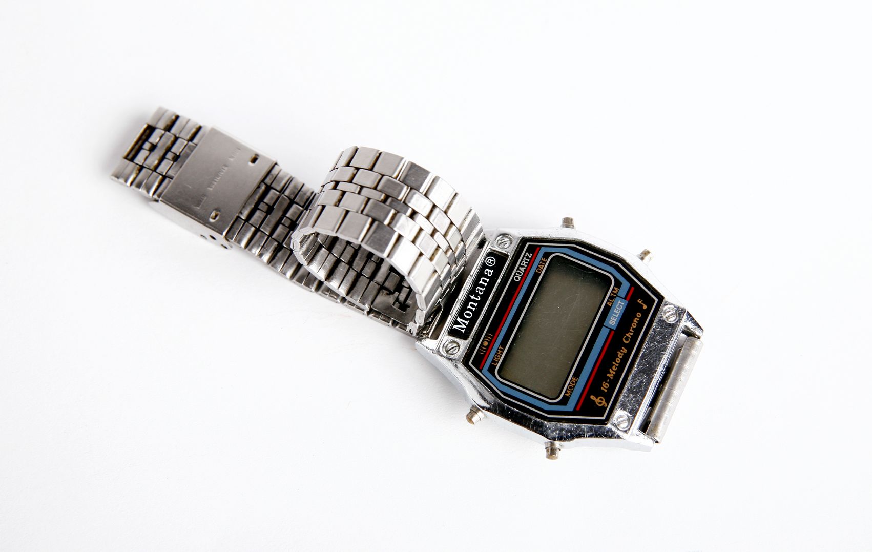 Elektroniczny zegarek naręczny marki Montana z metalową bransoletą.